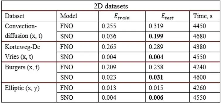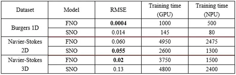 测试结果统计如图。其中,二维案例下SNO精度稍有提升,性能提升明显;一维和三维案例SNO表现不及FNO。