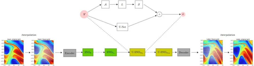 图中以二维物理场时序预测问题为例。首先,为了计算频谱卷积的正向和逆多项式变换矩阵,应在相应的Gauss正交节点(Chebyshev网格等)对输入进行插值。然后,通过卷积编码器将插值后的输入提升到更高维度。编码后的结果用来作为一系列SNO层的输入,每个层对其截断的频谱表示进行线性卷积。接着,SNO层的输出通过卷积解码器投影回目标维度,最后插值回原始节点。