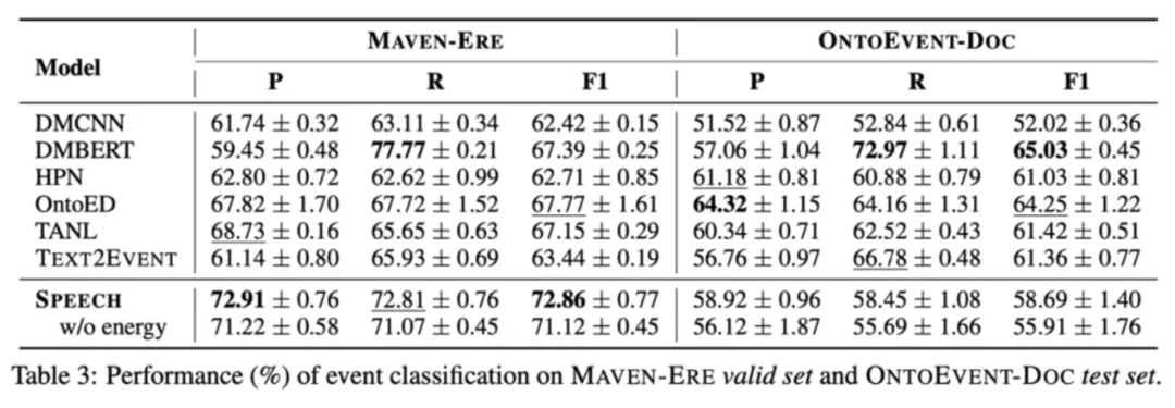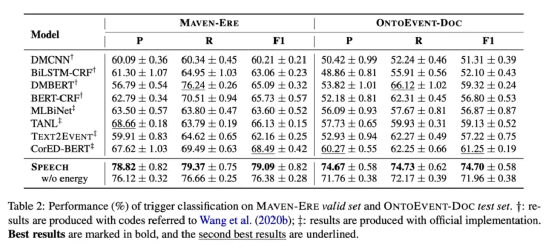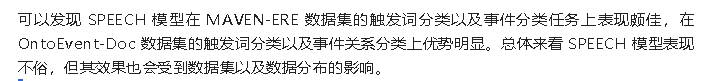 SPEECH使用基于能量的建模对事件结构化组件之间的复杂依赖进行建模,并使用简单但有效的超球体来表示事件类别。在MAVEN-ERE和OntoEvent-Doc两个事件数据集上进行的实验表明,SPEECH模型在事件检测和事件关系抽取任务上表现不俗。