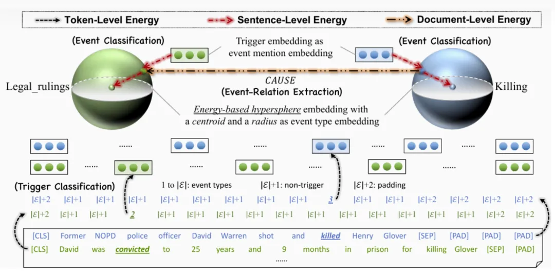 为了解决这些问题,本文提出了基于能量的超球体(SPEECH)以解决以事件为中心的结构化预测任务。SPEECH模型的设计灵感主要来源于万有引力定律和能量函数。如果把抽象的事件类别看成电子核/恒星,其对应的样本就可看成核外电子/行星。因此本文提出利用基于能量的超球体来建模事件类别及其样本。模型主要与 token、sentence、document三种维度的能量相关联。