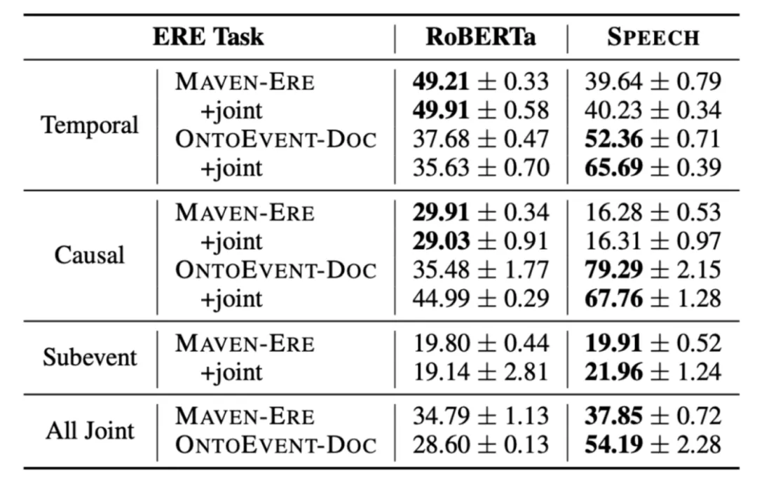 本文主要在三类以事件为中心的结构化预测任务上进行了实验,用到的数据集是最新发布的 MAVEN-ERE 以及 OntoEvent-Doc。由于 MAVEN-ERE 没有直接发布测试集标签,本文的实验是在 MAVEN-ERE 的验证集以及 OntoEvent-Doc 的测试集上进行的。