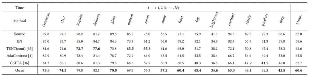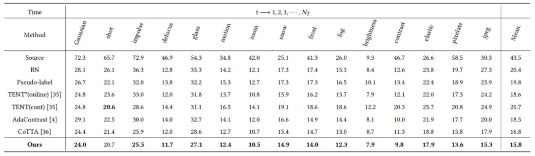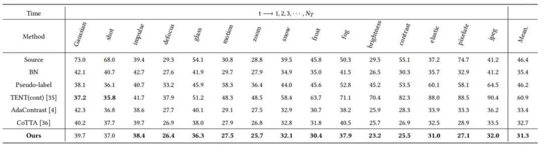 本文在多个公开数据集上进行了实验,迁移任务包括CIFAR10-to-CIFAR10C, CIFAR100-to-CIFAR100C and ImageNet-to-ImageNet-C。实验结果表明论文所提方法相比其他方法表现更好(指标为分类错误率):