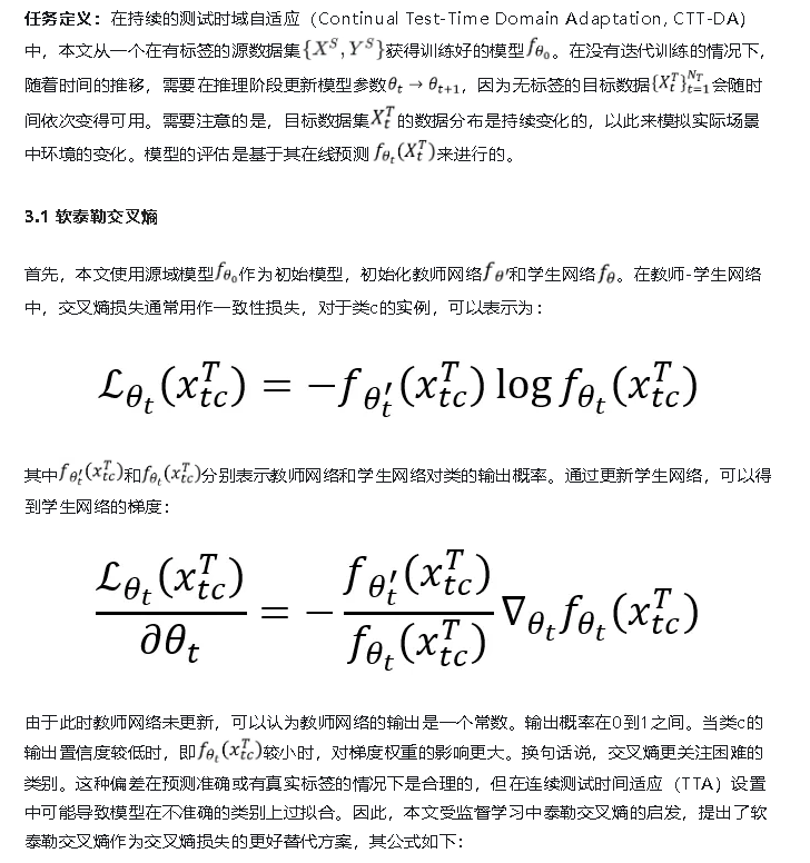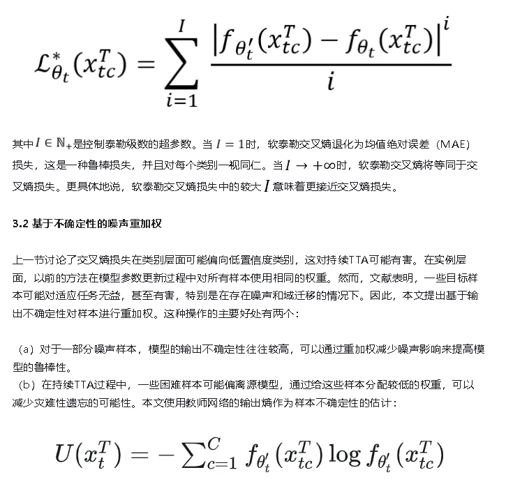 这篇论文从噪声鲁棒性的角度出发,提出了一种新的方法来解决持续TTA中的噪声问题。论文通过三种有效策略来减轻噪声的影响:在类别层面使用泰勒交叉熵损失来减轻与交叉熵相关的低置信度类别偏差;在样本层面根据不确定性重新加权目标样本,防止模型对噪声样本过度拟合;最后,为了减少伪标签噪声,论文提出了一种软集成负学习机制,使用集成补充伪标签来指导模型优化。