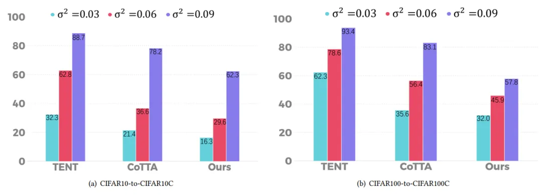 本文还在目标域的每幅图像中添加了方差分别为 0.03、0.06 和 0.09 的高斯噪声,以测试该方法对强噪声的鲁棒性。得到了CIFAR10C和CIFAR100C数据集上的分类错误率(%):