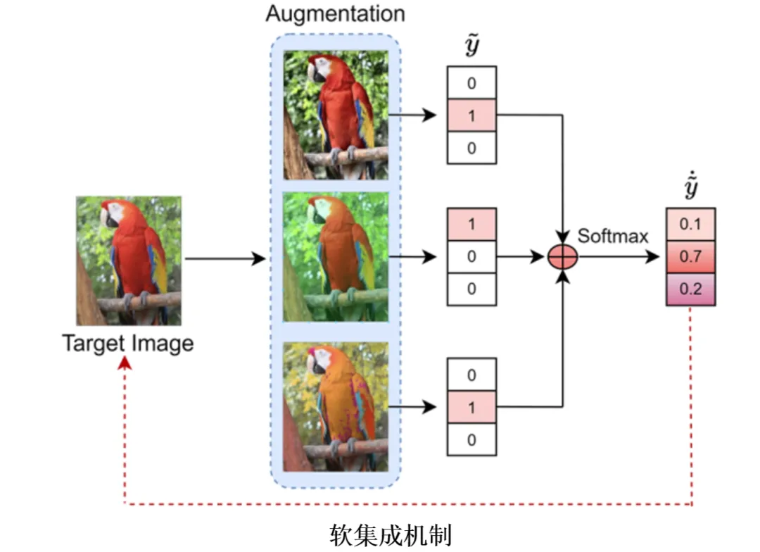 为提高互补伪标签的准确性,本文还使用集成机制来汇总同一目标图像不同增强版本的模型输出的互补标签。使用的增强工具包括颜色抖动、随机仿射、高斯模糊、随机水平翻转和高斯噪声,如上图所示。最终,本文应用softmax操作模拟真实标签分布,防止模型过拟合。该过程可以表示为: