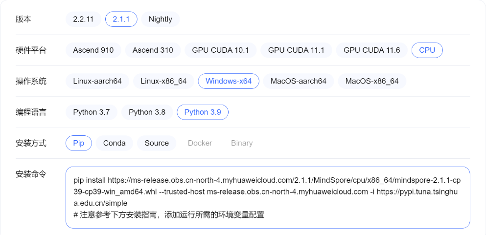 在官网选择对应的版本,电脑有GPU的可以安装Cuda,基础版通过pip安装cpu