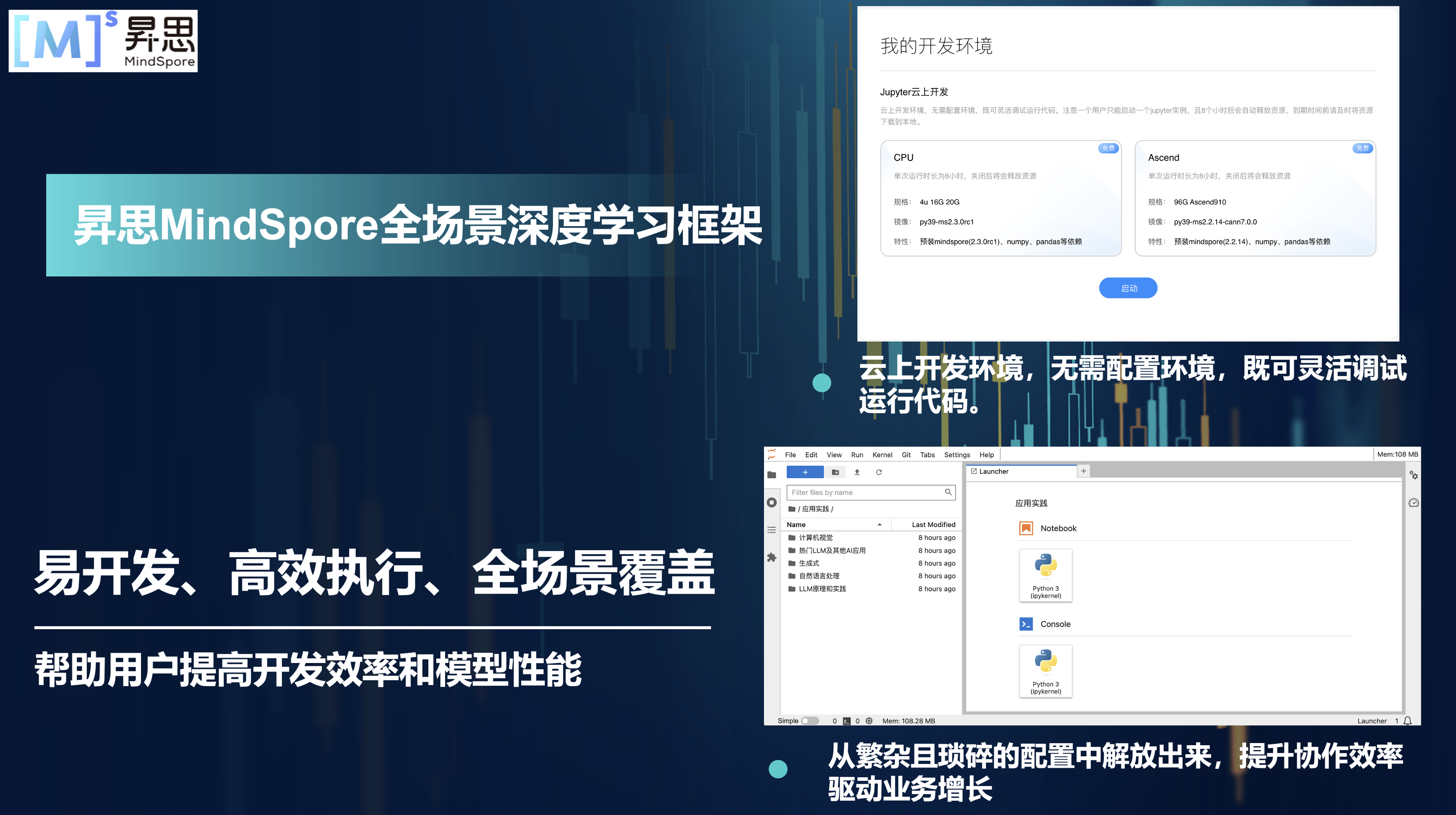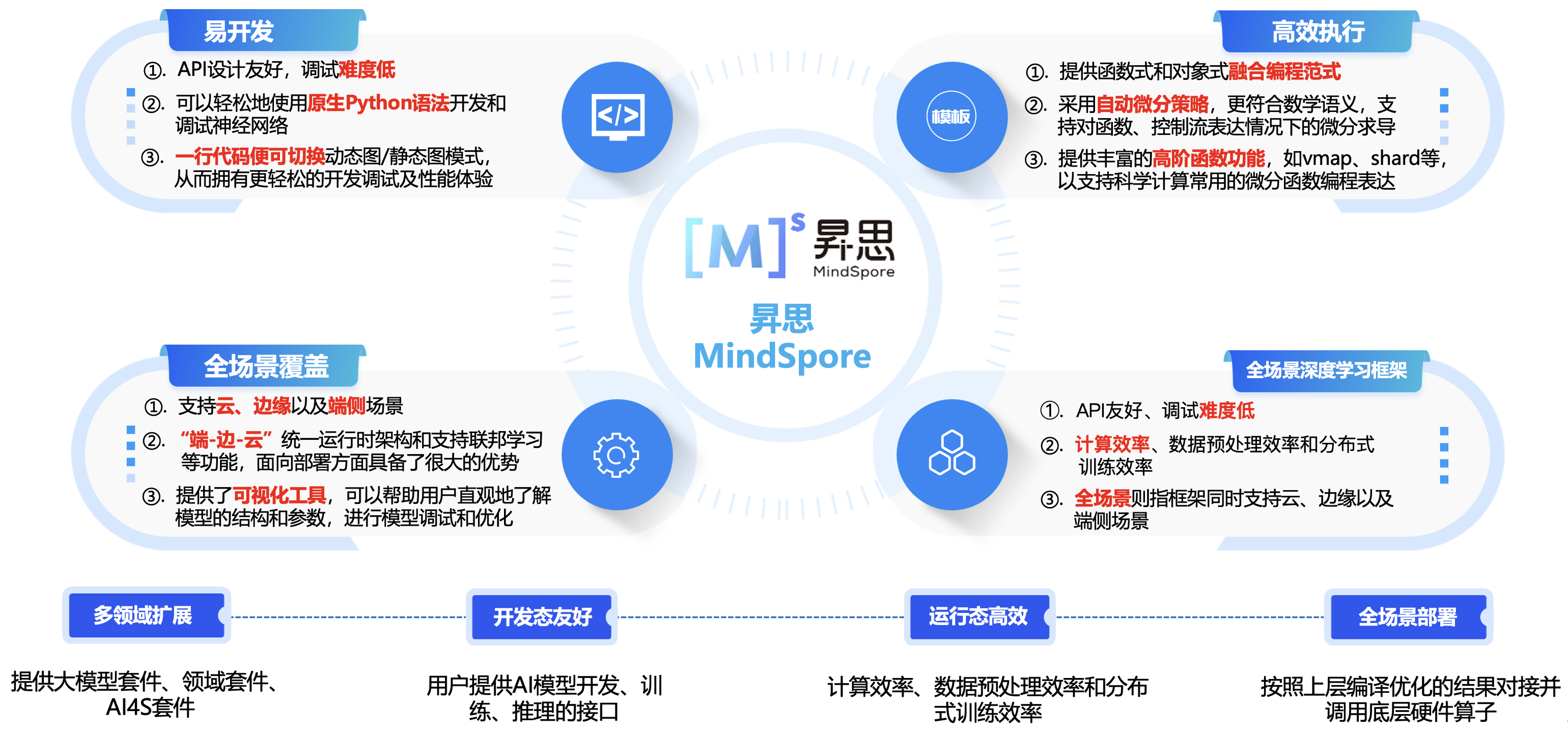 昇思MindSpore着重提升易用性并降低AI开发者的开发门槛,易开发表现为API友好、调试难度低;高效执行包括计算效率、数据预处理效率和分布式训练效率;全场景则指框架同时支持云、边缘以及端侧场景。