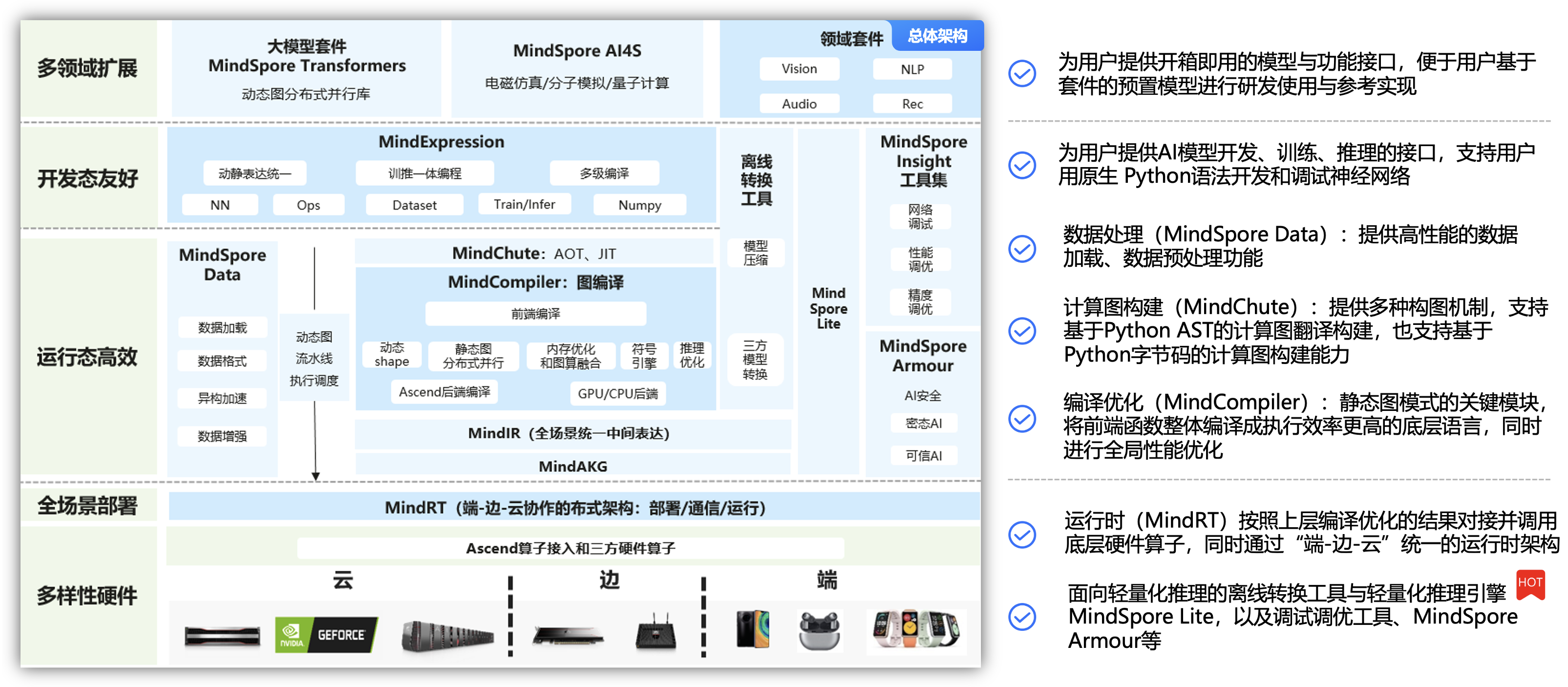 - ⑤. 全场景部署和多样性硬件:运行时(MindRT)按照上层编译优化的结果对接并调用底层硬件算子,同时通过“端-边-云”统一的运行时架构,支持包括联邦学习在内的“端-边-云”AI协同。
