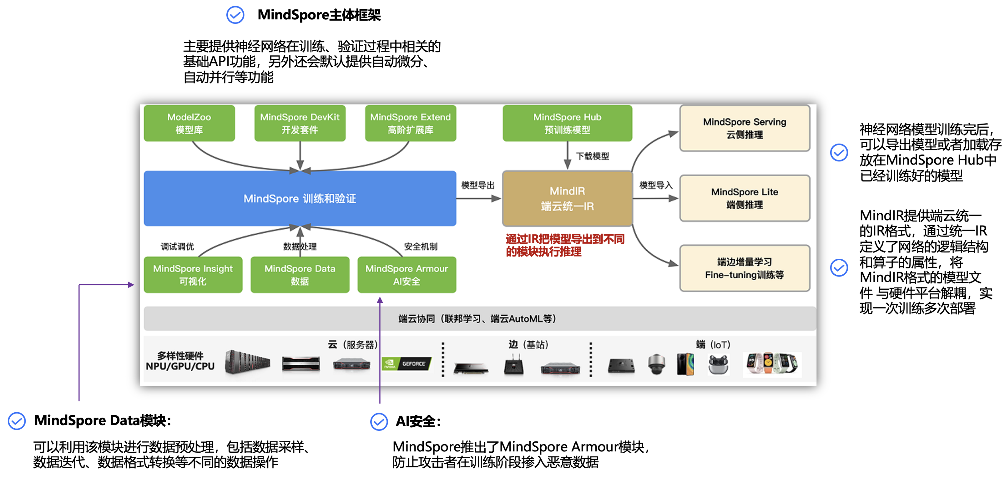 - ①. 左边蓝色方框的是MindSpore主体框架,主要提供神经网络在训练、验证过程中相关的基础API功能,另外还会默认提供自动微分、自动并行等功能。