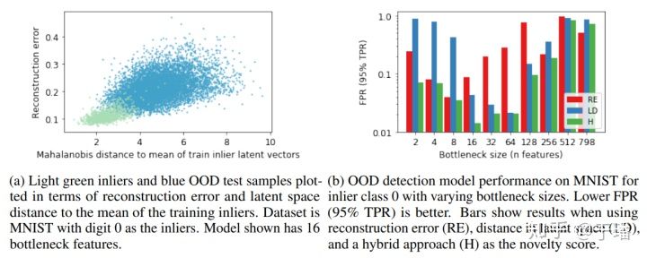 有文章也指出,只基于VAE进行重构误差的比较很难得到一些特定的异常样本,这些样本在隐空间中距离样本距离很远,但是在流形空间中距离很近。因此,作者使用马氏距离来衡量样本在流形空间中的距离,这样结合重构误差和马氏距离一起来检测出OOD样本。下图是文章中OOD样本的检测效果图。