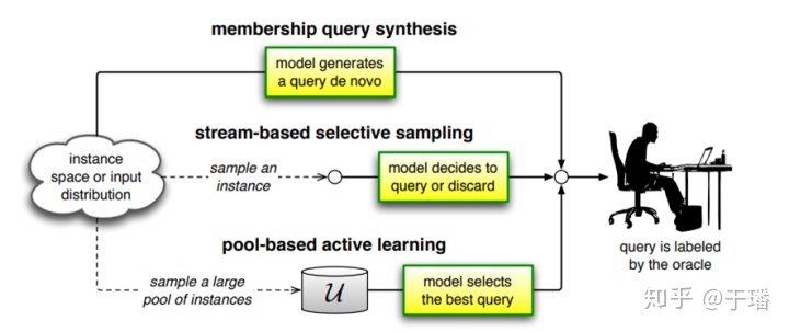 下图表明了主要的三种选择策略方法,分别是Membership Query Synthesis、Stream-Based Selective Sampling和Pool-Based Sampling。