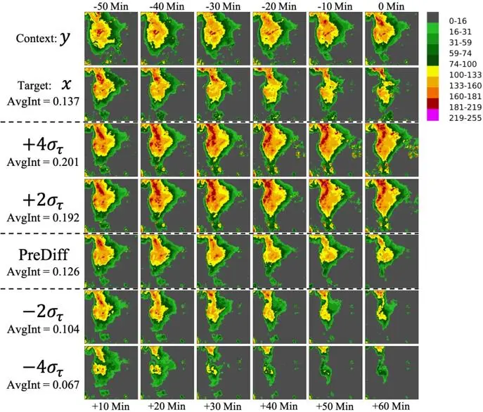 我们评估了 PreDiff 在 SEVIR 上预测近期降水强度(“短临预报”)的任务。我们使用预期降水强度作为knowledge control来模拟可能的极端天气事件,如暴雨和干旱