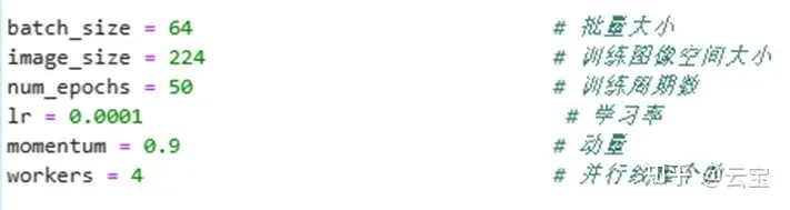设置超参,包括学习率,动量、训练批次、训练周期数等等。