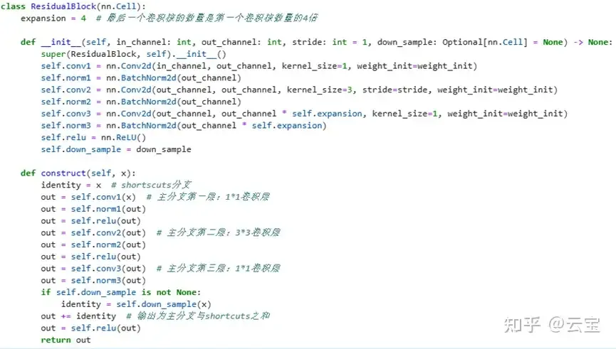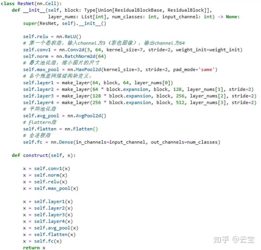 重写ResNet类的init和construct函数,将各种结构和层级堆积在一起,构成resnet50网络。