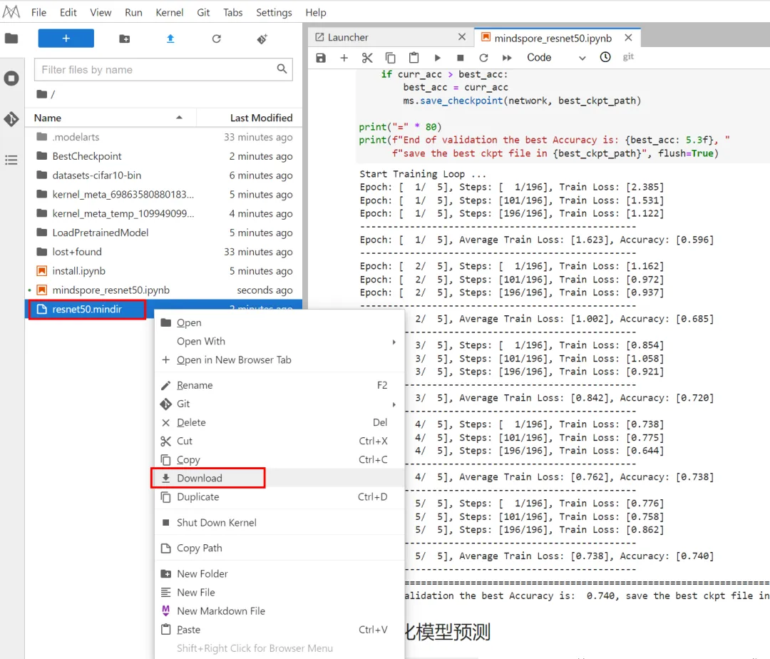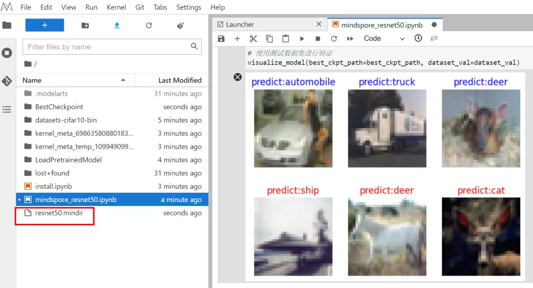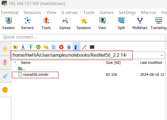 在“/home/HwHiAiUser/samples/noteboooks”目录下创建ResNet50_2.2.14文件夹,将训练获得的mindir模型文件放入该文件夹。