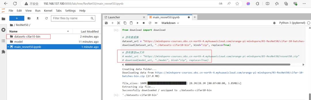 打开main_resnet50.ipynb文档,在下载环节,注释掉om文件下载的代码,保留数据集下载的代码。