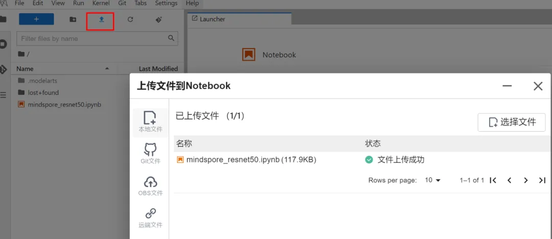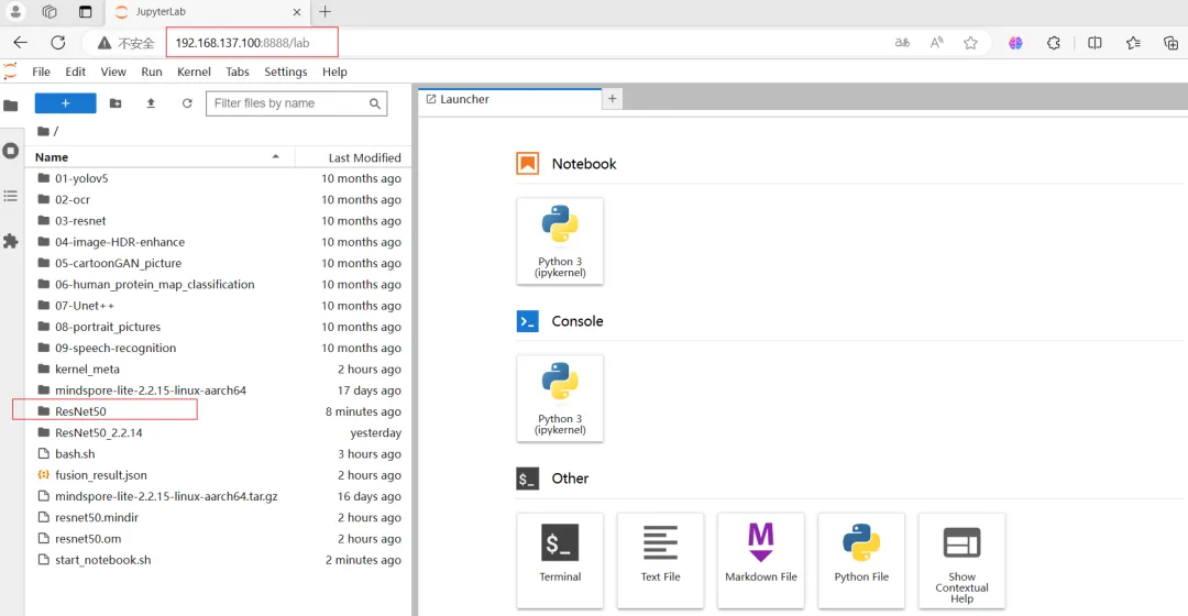 打开notebook运行环境,可以看到创建的ResNet50项目文件夹。