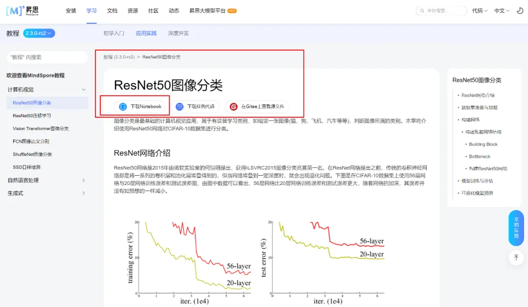 进入昇思MindSpore官网,下载ResNet50案例的notebook文档,链接如下:https://www.mindspore.cn/tutorials/application/zh-CN/r2.3.0rc2/cv/resnet50.html
