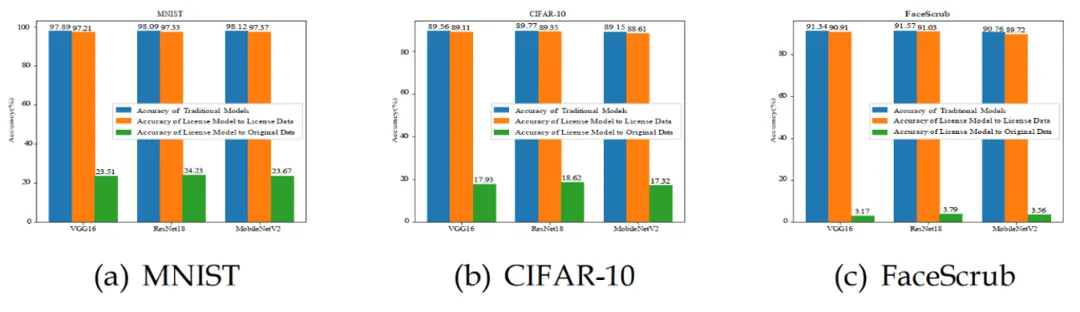 我们通过评估风格许可模型的准确性来验证我们提出方法的可用性,所有实验结果都是基于MindSpore框架得出的。首先,我们在 VGG16、ResNet18 和 MobileNetV2 上使用 MNIST、CIFAR-10 和 FaceScrub 基准数据集训练了传统的分类模型,并将它们的准确性作为基准指标。随后,我们使用风格数据集(Styled Dataset)、原始数据集(Original Datasets)及其相应的风格化原始数据集(Styled-Original Datasets)训练了风格许可模型。然后,我们将风格许可模型在原始数据和许可数据上的准确性与基准模型进行了比较。实验结果如图2所示。