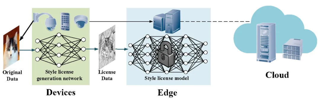 通过这种方法,我们实现了两个关键目标。首先,我们将访问控制机制直接嵌入到部署在边缘平台上的深度学习模型中。这种集成方式确保了即使攻击者获得了模型的参数和架构,他们也无法在没有正确风格许可的情况下使用该模型,从而主动保护了模型的知识产权,防止未经授权的使用。其次,在边缘计算场景中,终端设备通常容易受到中间人攻击、侧信道攻击以及网络流量监控等威胁。我们的方法通过在传输前将原始数据转换为风格化数据,减少了这些风险,从而在一定程度上增强了原始数据的隐私保护。接下来将对该方法进行更为详细的解释。
