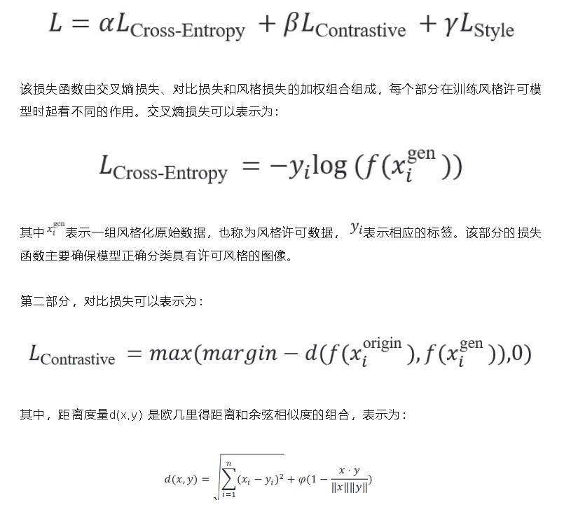 为了确保模型仅在风格许可数据上有效,而在其他数据上无效,我们为风格许可模型设计了一个专门的训练方案和损失函数。风格许可模型的训练过程涉及三个数据集:包含许可风格图像的风格数据集、原始非风格化图像的原始数据集、通过将原始图像转换为许可风格得到的风格化原始图像数据集。为了实现我们的目标,我们开发了一个专门的损失函数,旨在风格许可模型的训练过程中实现收敛,损失函数公式如下: