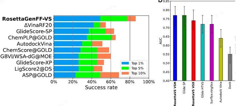 RosettaVS在多个基准测试集上表现出了优异的性能,包括CASF2016和DUD数据集。它在区分天然结合姿势和诱饵结构方面取得了领先的成绩,并且在预测配体结合亲和力方面也显示出了高准确性。利用OpenVS平台,研究人员成功从数十亿种化合物库中筛选出了具有个位数微摩尔结合亲和力的命中化合物,且筛选过程在不到七天内完成,显示了其高效的筛选能力。