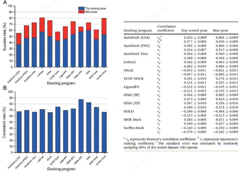 •打分性能的评估也表明,同一软件对不同蛋白家族的打分性能差异很大,因此不同蛋白的对接研究可能需要使用不同的软件。评价结果还发现,没有一个软件可以在采样性能与打分性能两样优于其它软件,因此最好的虚拟筛选解决方案是组合使用几种不同的对接软件。