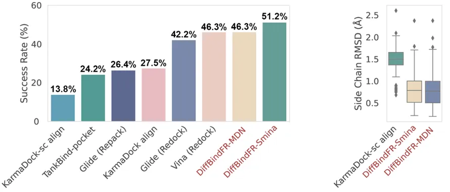 在PDBbind测试集上,DiffBindFR在分子对接成功率上超越了传统对接方法和深度学习方法,能够高精度预测蛋白配体结合口袋中残基的侧链构象,且该方法生成的口袋-配体复合物的全原子模型具有很好的物理合理性。此外,交叉对接是更能检验柔性对接方法应用潜力的任务,而该方法在交叉对接中也展现出了优异的性能(比如能够处理AlphaFold2预测的蛋白质结构中侧链构象阻挡配体分子进入正确结合位置的问题)。