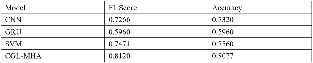 实验结果显示,CGL-MHA模型在Headlines数据集上取得了81.20%的准确率和80.77%的F1分数。相比传统的讽刺检测模型,CGL-MHA利用CNN提取局部特征、GRU和LSTM捕捉短期和长期依赖关系,再加上多头注意力机制的聚焦能力,使得模型能够有效识别文本中的讽刺表达。