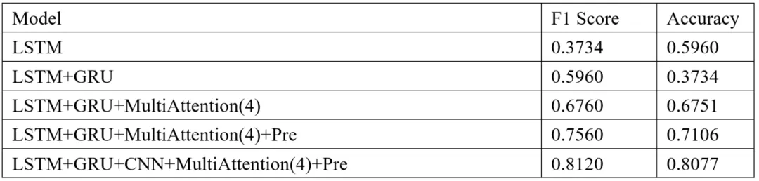 此外,我们还进行了消融实验,以评估模型各组件(CNN、GRU、LSTM和多头注意力)对整体性能的贡献。实验结果表明,去除任一组件都会导致模型性能的显著下降,尤其是多头注意力机制和预训练的词嵌入层对模型的讽刺检测效果起到了关键作用。