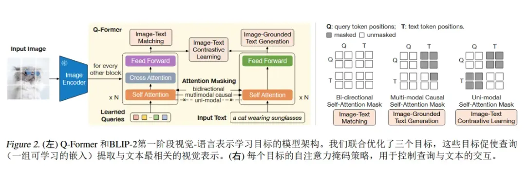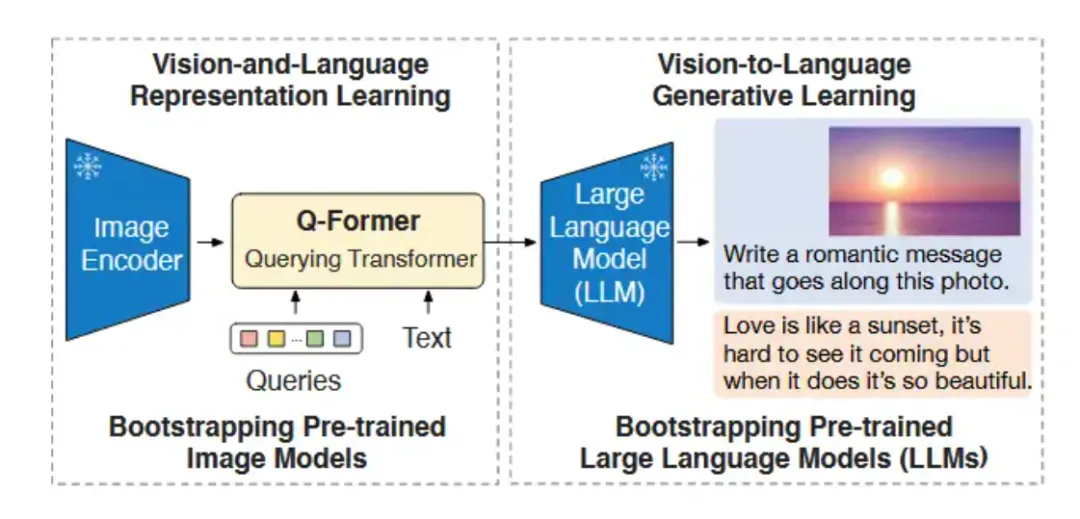 BLIP-2 提出了一个新的高效预训练策略,用于解决视觉和语言联合学习任务中的计算成本问题。相比其他模型,BLIP-2 的最大创新点在于,它引入了冻结的预训练图像编码器和冻结的大型语言模型(LLM),通过一个**轻量级的查询转换器(Querying Transformer, Q-Former)**来弥合视觉和语言的跨模态差距。
