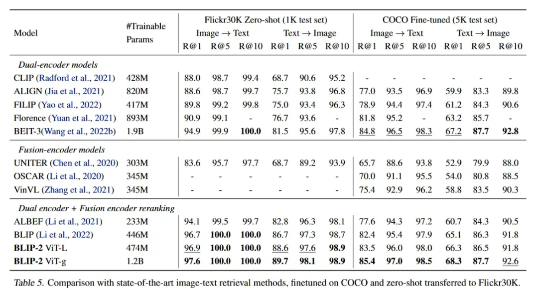 **3、图文检索 (Flickr30K):BLIP-2 在 Image → Text 检索任务上达到了97.6%的 R@1(检索准确率),在 Text → Image 任务上达到了89.7%**的 R@1,这些结果均超过了之前的顶级模型。