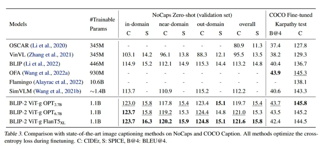 2、****图像字幕生成:在 NoCaps 数据集的验证集中,BLIP-2 获得了121.6 CIDEr和15.8 SPICE的得分,同样高于现有的 SOTA 模型。