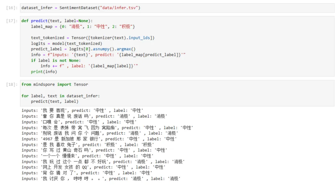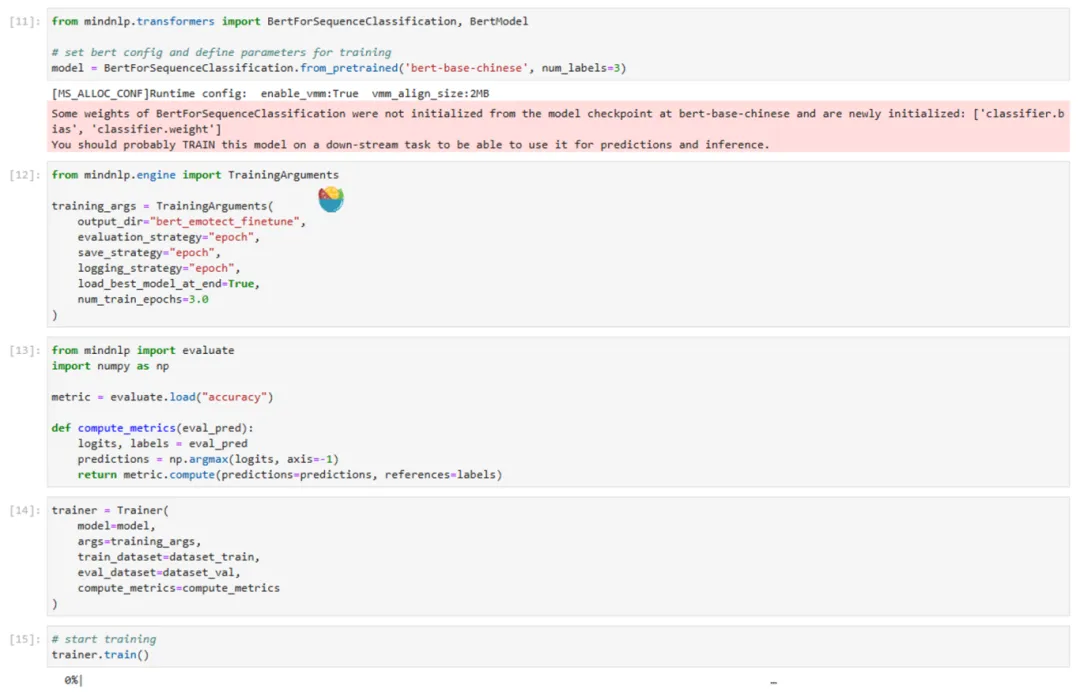 通过 BertForSequenceClassification 构建用于情感分类的 BERT 模型,加载预训练权重,设置情感三分类的超参数自动构建模型。后面对模型采用自动混合精度操作,提高训练的速度,然后实例化优化器,紧接着实例化评价指标,设置模型训练的权重保存策略,最后就是构建训练器,模型开始训练。