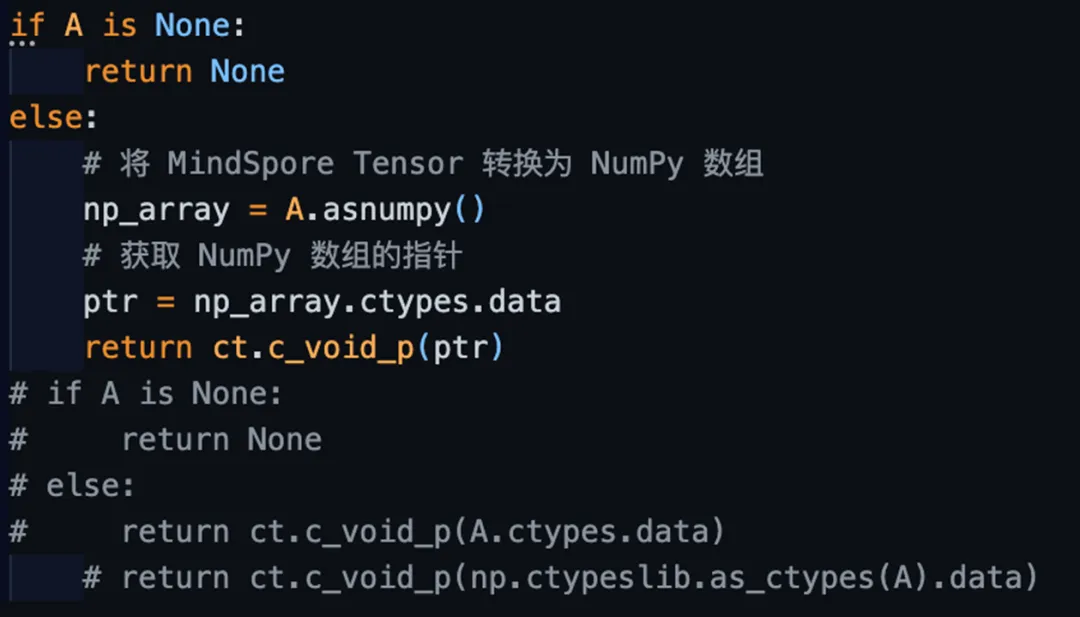 b)通过numpy实现,先通过asnumpy()获取numpy array,再获取numpy数组的指针,最终将numpy数组的指针传入算子,计算完之后再进行一遍相反的过程得到mindspore Tensor 。(影响速度和显存)