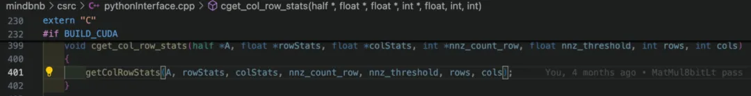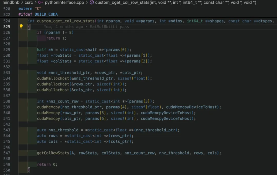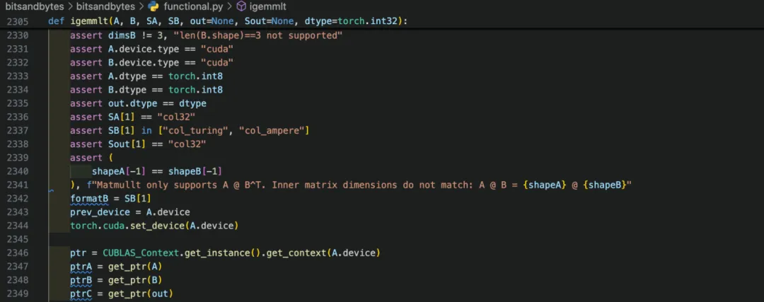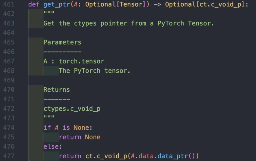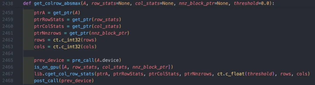 其中lib是通过预先编译CUDA算子得到的.so文件进行加载得到的,ptrA, ptrRowStats, ptrColStats, ptrNnzrows都是通过get_ptr函数获取的指针。而get_ptr函数需要从Tensor中获取数据的指针,如下所示: