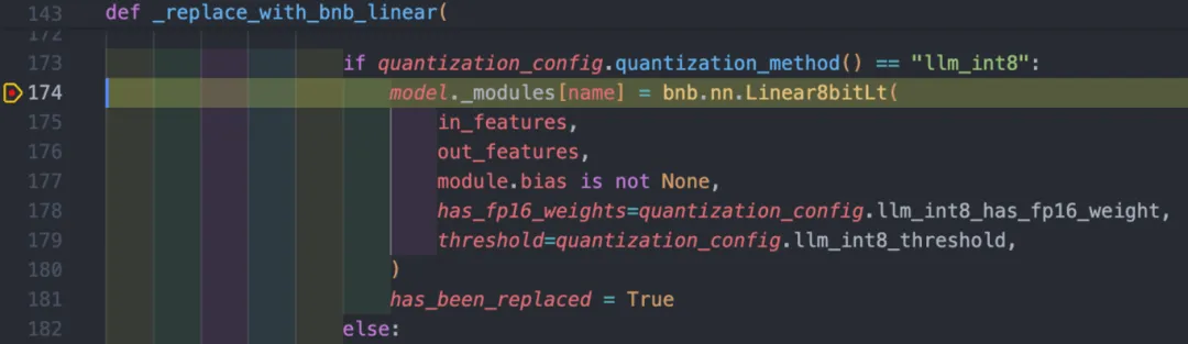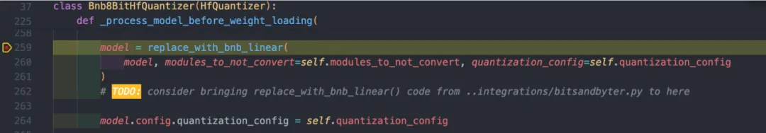 安装部署好bnb之后,为了探究量化的过程,需要从transformers的from_pretrained接口出发,可以打断点调试,观察bnb是如何在加载预训练模型的过程中完成对权重的量化的。主要分为以下三部分:
