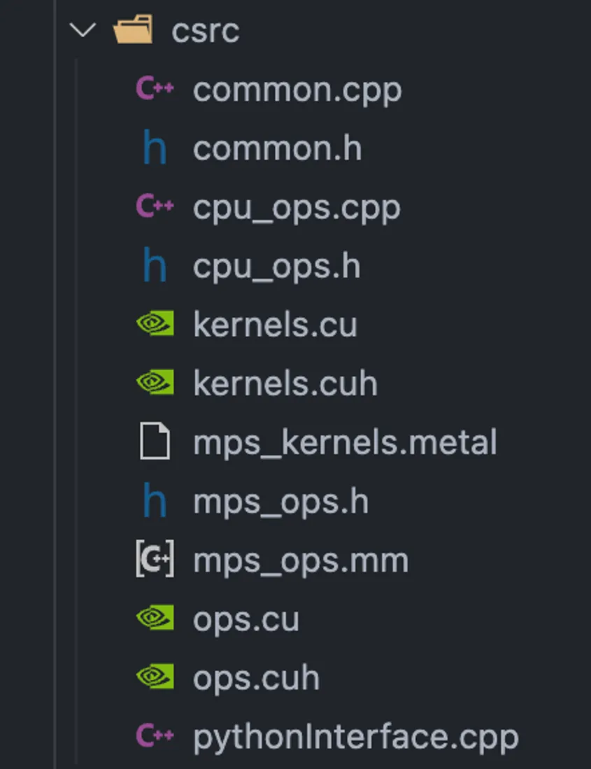 由于bnb中本身包含了大量量化过程中会使用的高度优化的CUDA核函数,并把它们封装成算子,又由于算子被进一步封装为python文件调用的接口,写在pythonInterface.cpp里,bnb项目构建时会将众多算子根据接口文件中的实现打包,根据当前是否使用GPU和系统安装的CUDA工具链的版本,预编译生成一个动态链接库文件。原本bnb是通过ctypes库来加载dll动态链接库,便可直接访问pythonInterface.cpp中定义的c++函数。问题就在于如何尽可能复用底层CUDA算子代码,并在Python侧提供一种高效的算子调用方式。