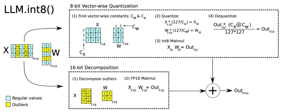 LLM.int8()是一种采用混合精度分解的量化方法。先做一个矩阵分解,对绝大部分权重和激活用8bit量化(vector-wise)。过程中对离群特征的几个维度保留16bit,对其做高精度的矩阵乘法。计算示意图如下: