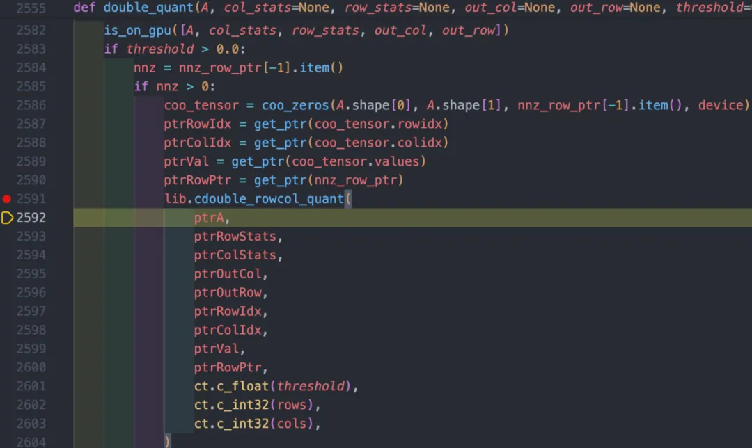 这里以cdouble_rowcol_quant为例,从Linear8bitLt layer到这个算子的函数调用栈为:Linear8bitLt=>bnb.matmul=>MatMul8bitLt=>double_quant=>lib.cdouble_rowcol_quant,这是一种由上至下的执行路径,这样的执行路径还有多条,但在开发过程中可以先解决其中一条路径,总结出方法经验,再采用DFS式的开发逐个击破。