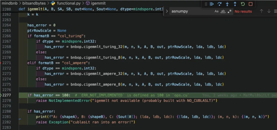 3、频繁规律调用asnumpy导致流水线等待,经过仔细排查,发现程序中并没有直接使用asnumpy,最终发现在下图位置因为自定义算子返回的是Tensor,所以这里has_error是只含一个元素的Tensor,这里直接比较它的值,隐式调用了asnumpy。asnumpy会把值从GPU拷贝回CPU,造成流水线等待。为了解决此问题,直接给自定义算子加一个参数has_error,在自定义算子内部,将CUDA算子执行的返回值赋给has_error,使逻辑判断等号两边的数据类型一致,避免隐式调用asnumpy。