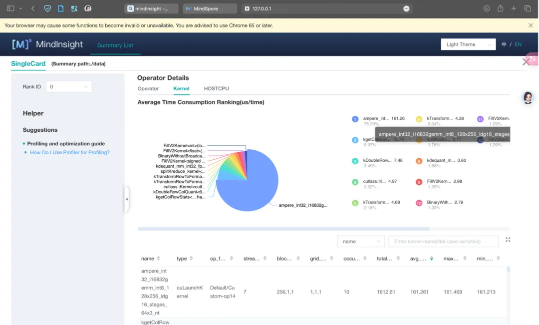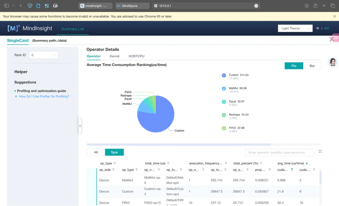 在基本完成所有编码工作,确保精度对齐PyTorch实现之后,发现性能上存在着较大差异。下图是使用MindSpore Insight做profiling分析的算子与核函数耗时饼图。