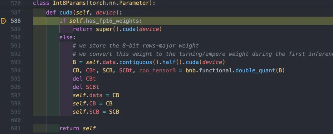 2、在加载预训练权重时,对高精度权重进行量化,将量化后INT8的权重给到module,bnb新实现了一个Int8Params类,重载了to方法,于是在to(device)时,to方法中会调用.cuda()函数,并在里面实现量化权重的计算。