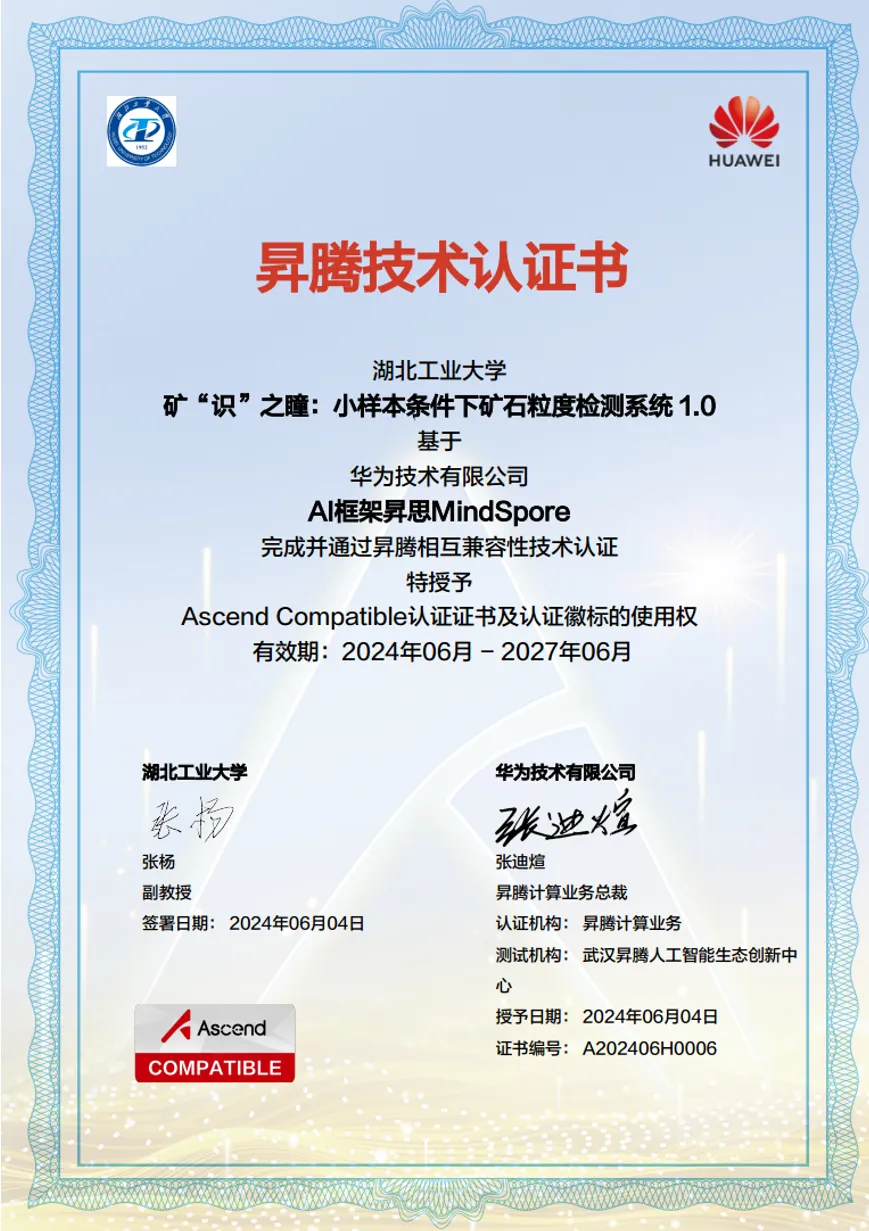 基于昇思MindSpore AI框架的全场景开发优势,团队构建了一套从云端训练到边缘部署的完整解决方案。MindSpore框架支持NPU、CPU、GPU等多种计算平台,采用统一的API设计,使得模型能够在不同场景下灵活切换和部署。针对矿石数据标注难,标注成本高,现有高质量的矿石标记样本少,团队设计了基于小样本学习的矿石粒度检测网络结构,借助迁移学习等技巧,仅使用十张样本训练网络,就能得到与目前传统目标检测算法相媲美的精度和速度,团队使用自主设计的轻量级主干使模型大小减少93.6%。在人工智能领域发表了1篇高水平论文。得益于MindSpore与昇腾AI处理器,模型在边缘设备上也能实现高效推理。团队目前正在探索利用基于MindSpore的Diffusion等多模态大模型来进行数据增强和扩充,以进一步提升系统性能,相关工作还在进行中。