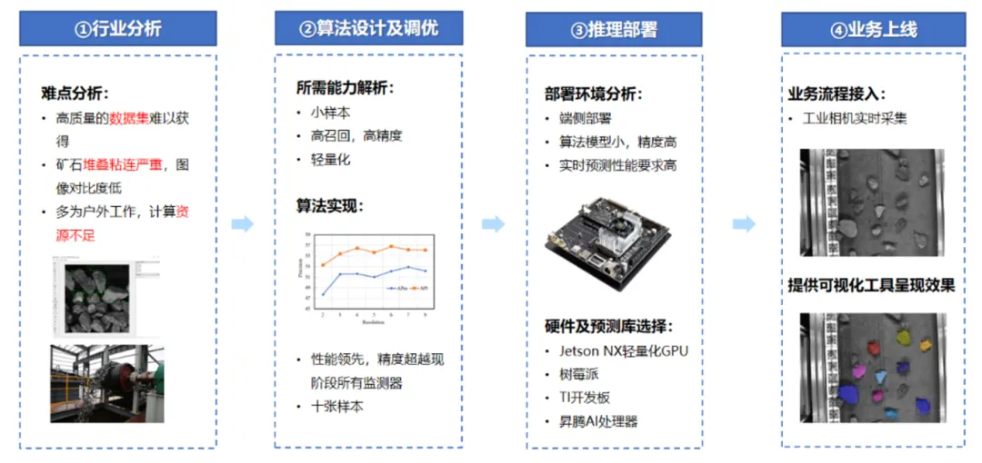 在基于深度学习的矿石图像小样本识别网络构建与部署的过程中,团队先对行业进行分析:市场需求方面,我国大型煤炭企业的自动化率连年上升,同时在智能化采掘各方面也在稳步上升,但当前行业存在精度低,效率低,隐患多等问题,而市场所需的是高准确率,高实时性,高可靠性的高性能系统。市场需求与行业现状严重不匹配,存在市场空白矿石检测应用约束多。针对矿石粒度检测方面主要存在难点:1标注难、人工标注成本高;2矿石堆叠粘连严重,图像对比度低,边界模糊;3井下环境硬件资源受限,这些难点进行设计算法并调优。随后分析部署环境,选择合适的硬件及预测库,最后接入流程,并提供可视化工具。