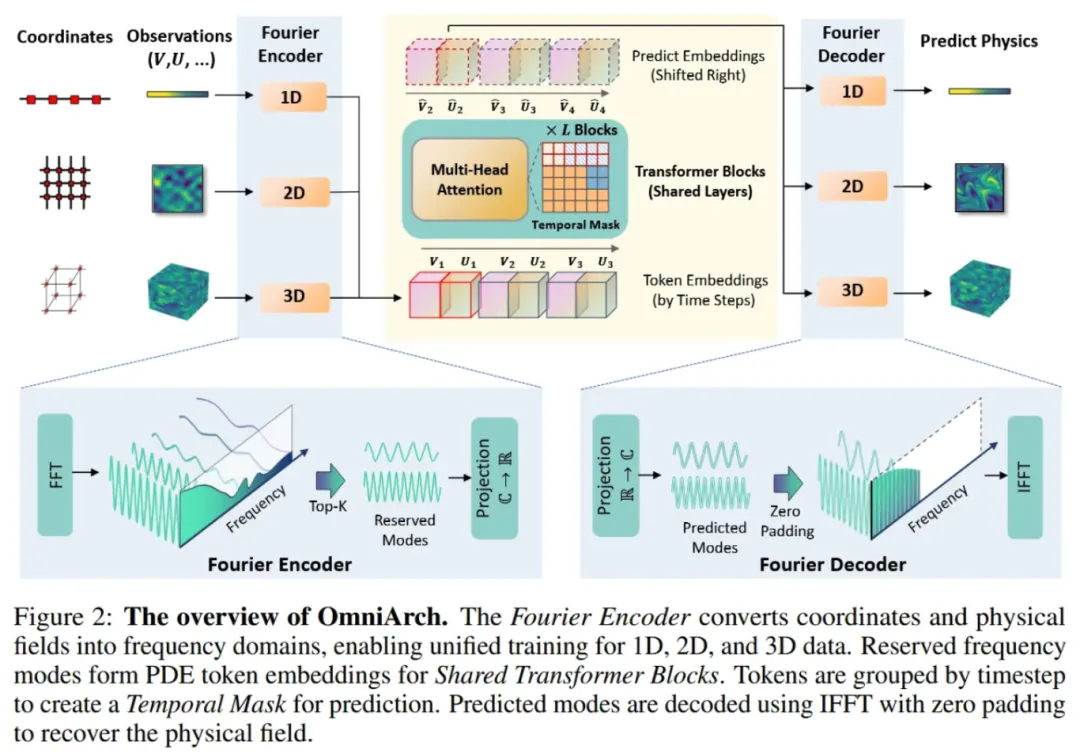 OmniArch的整体预训练框架如图2所示。通过傅里叶编码器将不同维度(1D、2D、3D)的物理数据坐标和观测值转换为频率域。高频和低频分量在频域中进行裁剪,以确保来自不同网格的数据具有相同长度的嵌入表示,这些表示通过共享的 Transformer 模块沿时间轴建模积分算子。通过时间掩码机制,每个物理量可以同时关注所有物理量以及以前的时间步长,最终通过傅里叶解码器从预测的频率域信号恢复物理场预测值。
