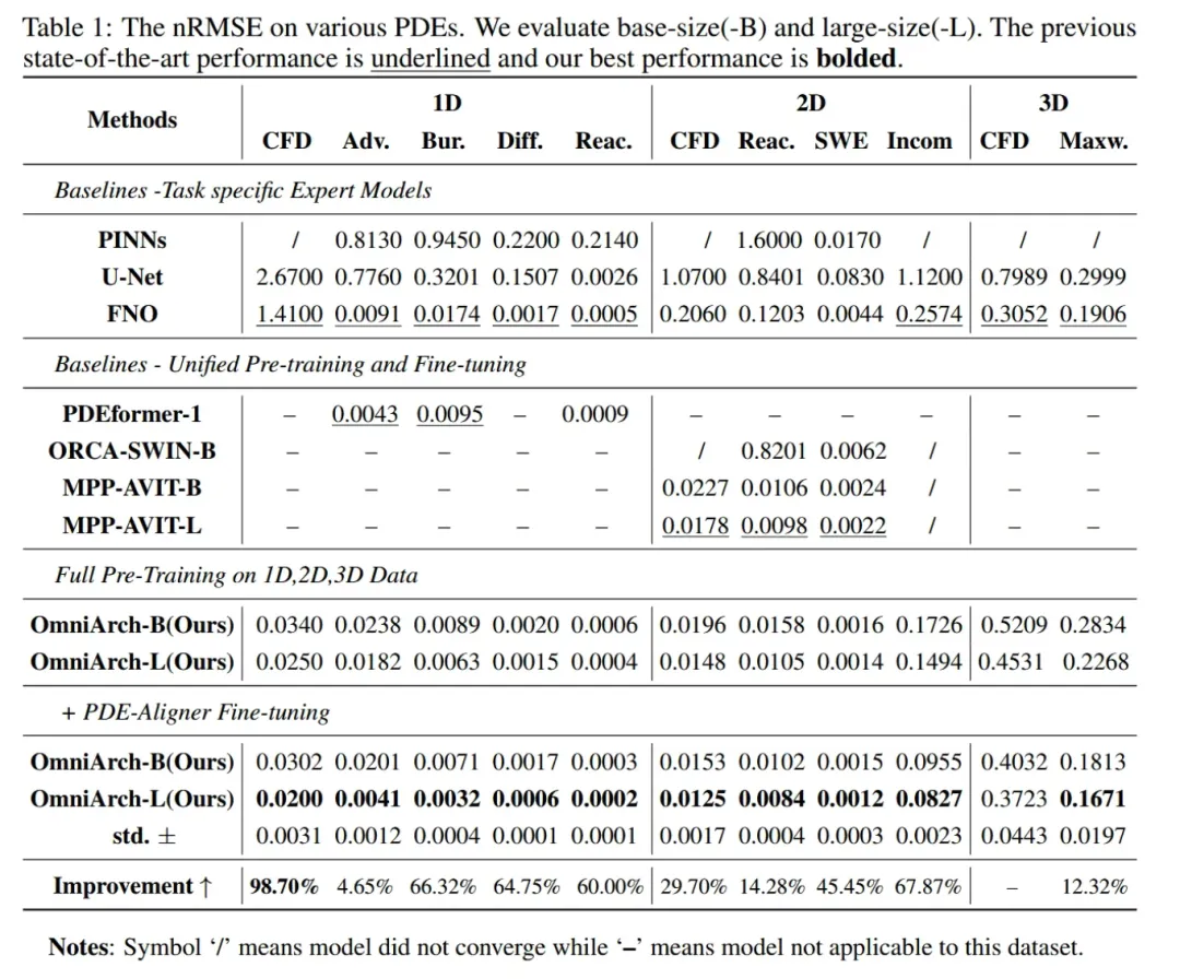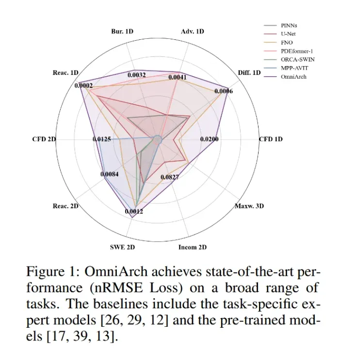 OmniArch采用"预训练-微调"策略:预训练阶段通过傅里叶编码器-解码器处理多尺度问题,并引入时间注意力机制增强多物理量泛化能力;微调阶段则通过PDE-Aligner模块深化物理规律的嵌入。实验表明,该模型在广泛任务中均实现了较优性能(nRMSE损失)。