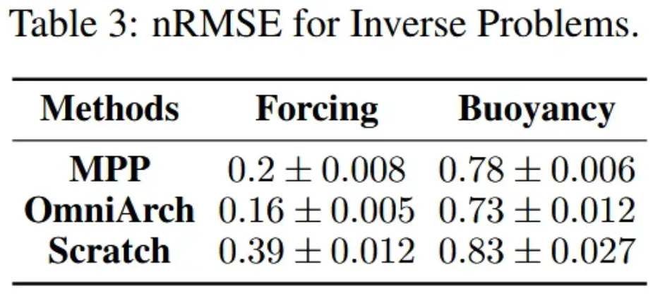 在逆问题方面,如表3所示,OmniArch在参数估计任务中显著优于MPP。相比之下,从零训练的模型产生最高的误差率,这不仅验证了预训练-微调范式的有效性,更证明OmniArch不仅擅长正向模拟,还能够准确推导复杂系统中的潜在动力学特征。