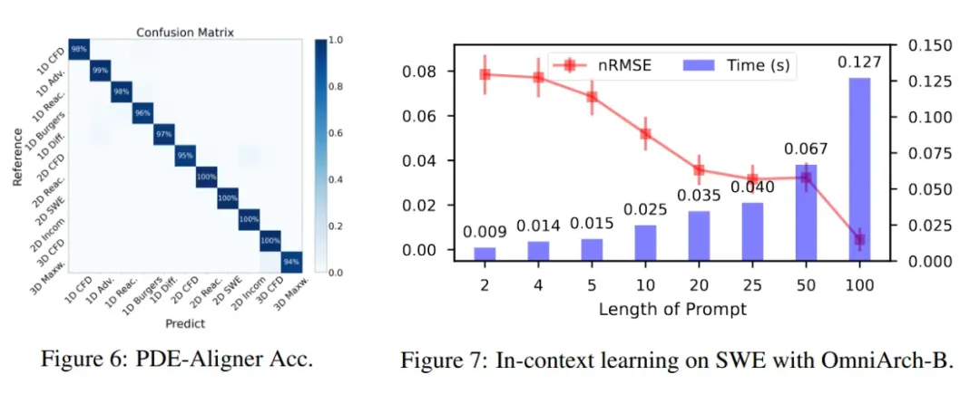 通过对多种动态系统进行自回归预训练,OmniArch表现出类似大语言模型的上下文学习能力,可从有限的时间步长序列中学习神经算子。实验表明,观测序列越长,预测精度越高且方差越小。然而,较短的观测序列相比完整序列可将推理速度提升至10倍(图7),在精度和效率间实现良好平衡。