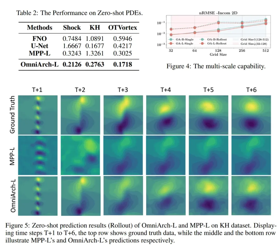 OmniArch 的多尺度推理能力也得到了充分的验证。图4展示了 OmniArch-Base 和 OmniArch-Large 在 2D Incom 上的多尺度推理性能,模型在不同分辨率的网格数据上表现出色,OmniArch 可以处理不同网格大小的输入,而无需重新训练,即使网格大小为 512,最大 nRMSE 仍低于 0.2。实验发现,256256的网格有时会比128128的网格达到更好或相当的性能。